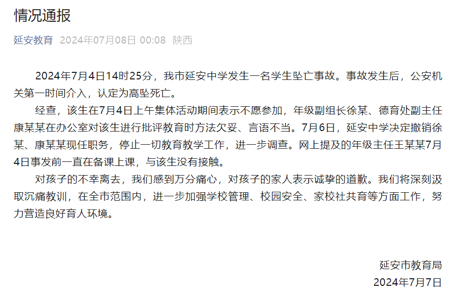 7月4日,一则关于陕西延安中学学生跳楼身亡的消息在网络上迅速流传,引起社会广泛关注。