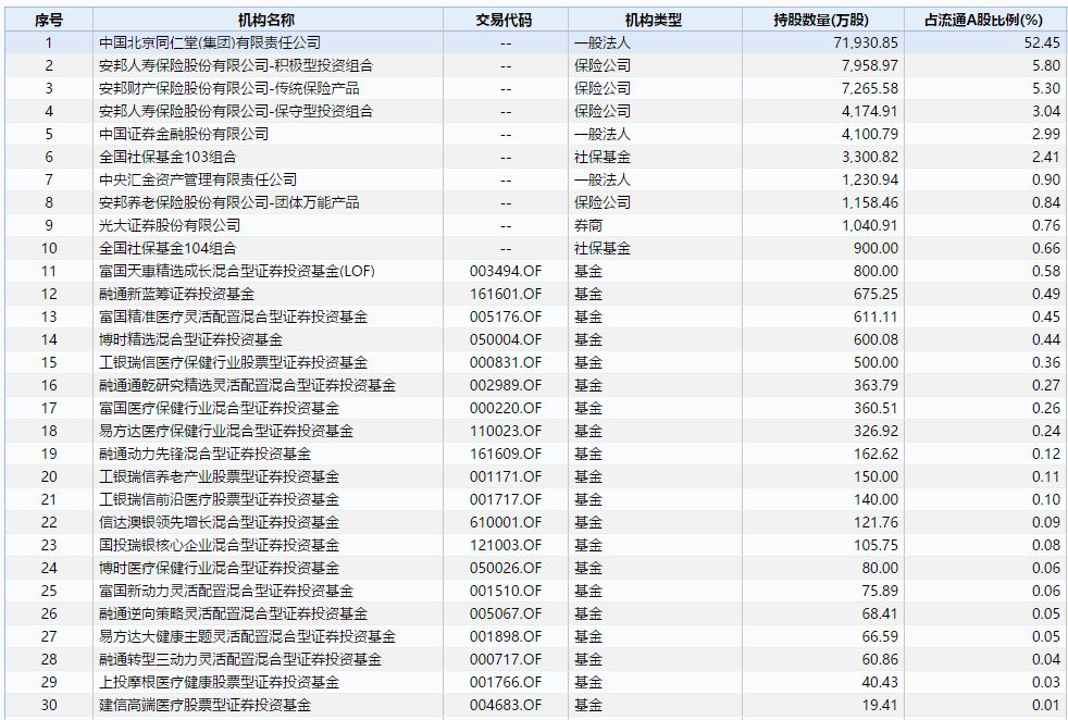在A股市场,同仁堂是重要的中成药龙头股,最新市值为412亿元。三季度末,41只偏股基金持有同仁堂5489.88万股,持仓市值17.43亿元。实际上,不只是公募基金,保险、社保、券商等机构也持仓不少同仁堂。