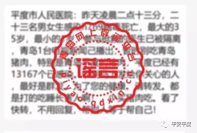 8月17日,平度市人民医院发布严正声明:微信所传“23名男女感染H7N9死亡、平度市人民医院抢救医生被隔离”实属谣言。