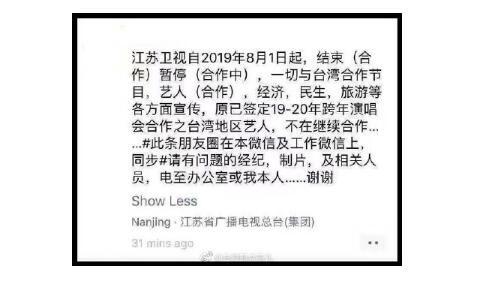 此前,网传江苏卫视自2019年8月1日起,结束(合作)暂停(合作中),一切与台湾合作节目、艺人、经济、民生、旅游等各方面宣传,原已签定2019-2020年跨年演唱会合作之台湾地区艺人,不再继续合作。
