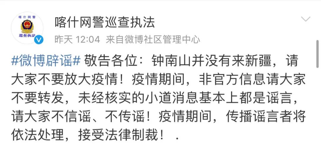 21日,喀什警方进行辟谣,“钟南山并没有来新疆”。