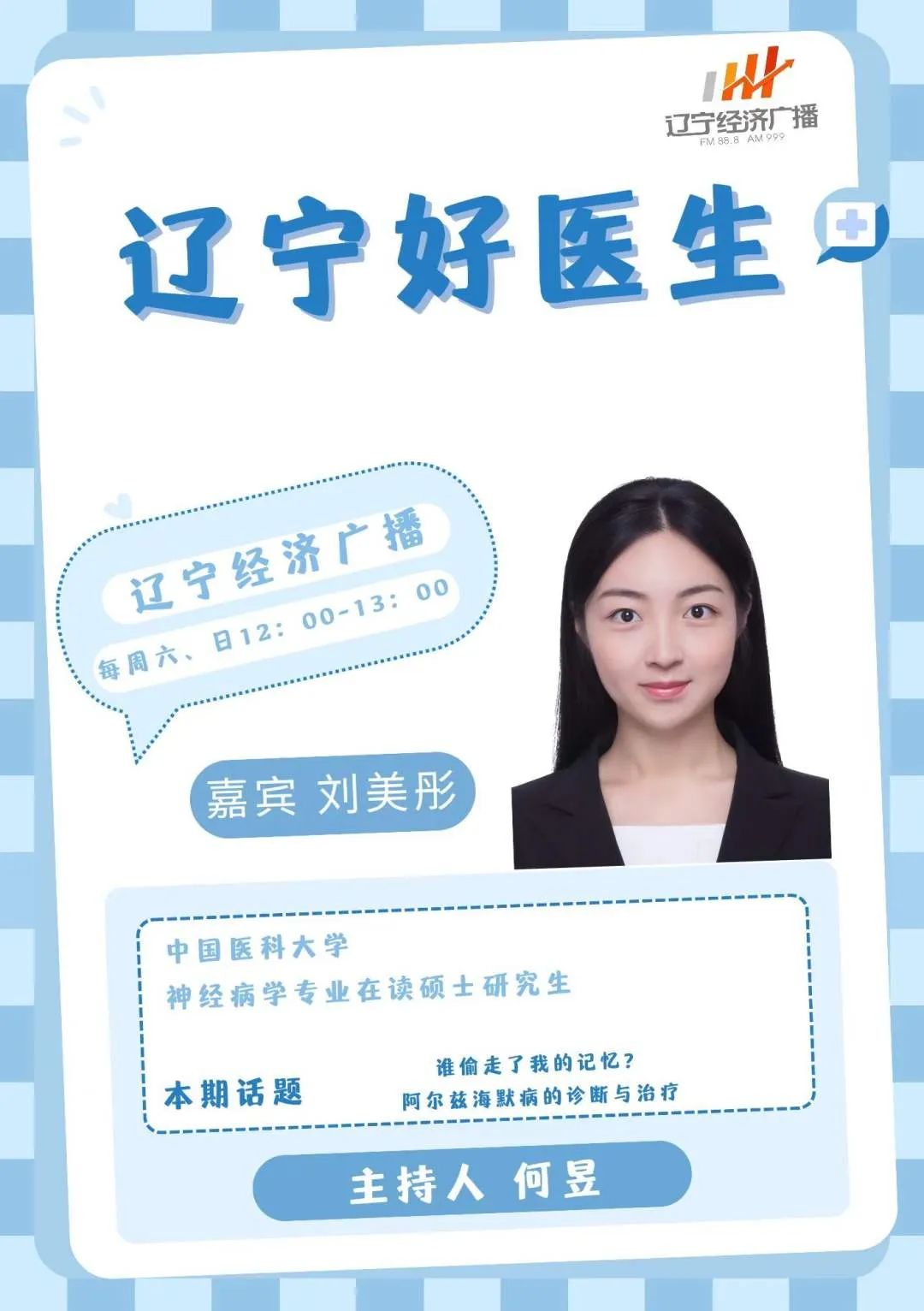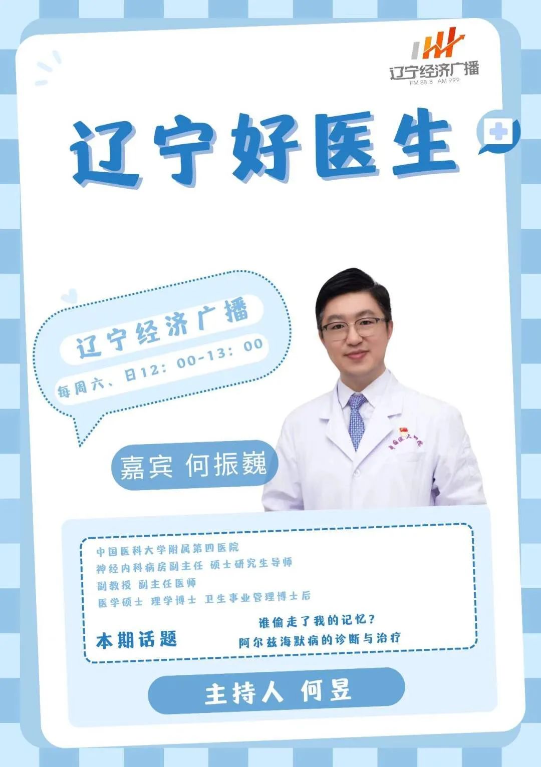 2024年6月2日(周日)中午12:00,FM88.8辽宁广播电视台经济广播《辽宁好医生》节目将邀请:中国医科大学附属第四医院神经内科病房副主任,副教授、副主任医师何振巍医生;中国医科大学神经病学专业在读硕士研究生刘美彤走进直播间,和您聊聊:谁偷走了我的记忆?阿尔茨海默病的诊断与治疗!欢迎收听、收看。