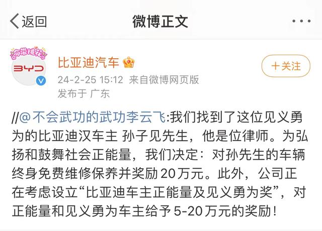 孙子见脱手的视频传开后,不少网友为其点赞,孙子见是比亚迪车主,比亚迪已决定对他的车辆终身免费维修调养,并奖励20万元,并在考虑设立“比亚迪车主正能量及见义勇为奖”,对正能量及见义勇为车主给予5-20万元的奖励。杭州市公安局上城区分局授予其三等治安荣誉奖章。