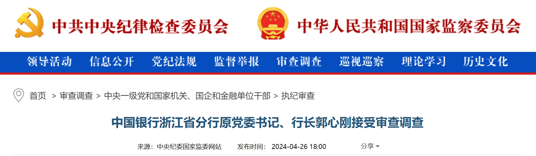 4月26日,中国银行浙江省分行原党委书记、行长郭心刚接受审查调查。