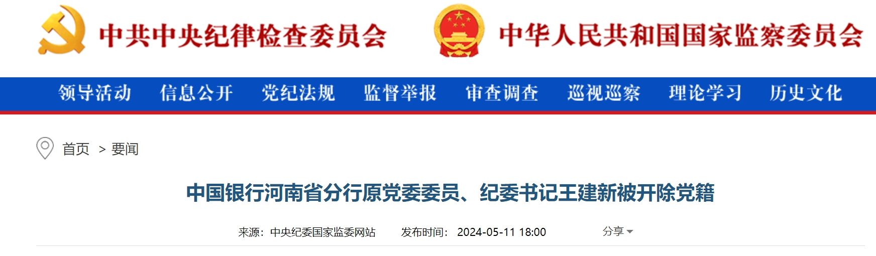 5月11日,中国银行河南省分行原党委委员、纪委书记王建新被开除党籍。
