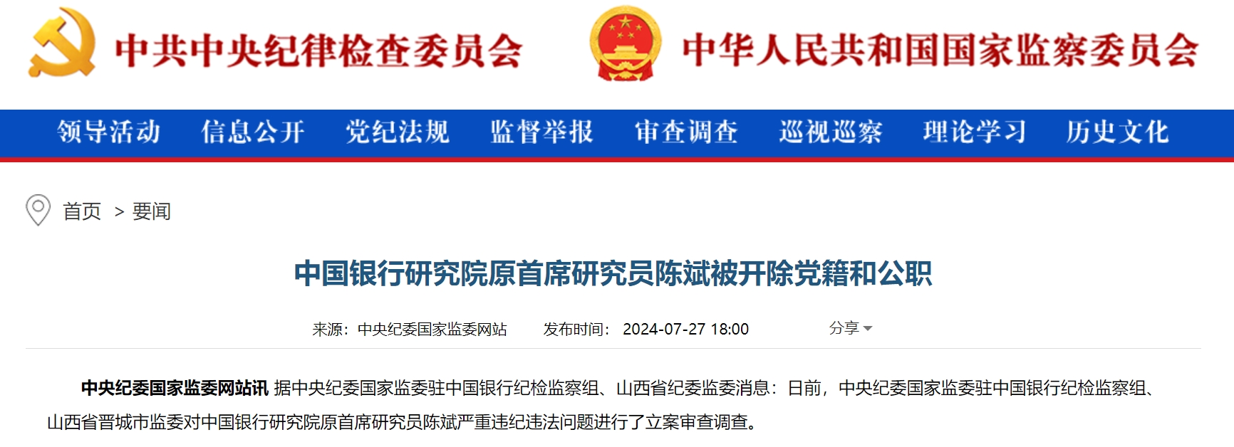 7月27日,中央纪委国家监委网站通报,中国银行研究院原首席研究员陈斌被开除党籍和公职。