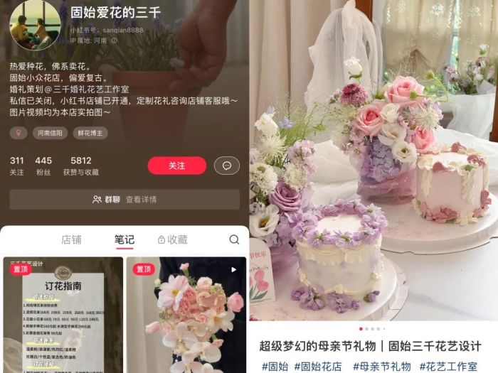2023年,三千在小红书上开设账号@固始爱花的三千,分享自己种花日常,和复古家居部署,还有以鲜花为主题的生活方式条记。