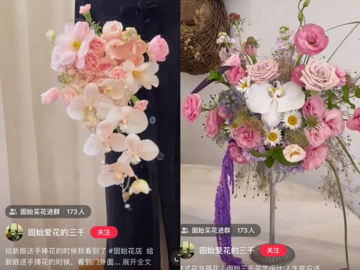 三千的客户大多是同城的女孩,职业以护士、老师、事业编的人为主,因为这些人在县城里属于收入稳定的人群,具备一定的消费能力。但是固始县的花店并不少,甚至可以用“卷”来形容,真正吸引客户一直回购和推荐新客户的因素,就靠作品的审美差别化。“从一开始做花束,我就希望客户收到和他们以前买的花束不一样的风格,打开一看是很惊艳的感觉。”