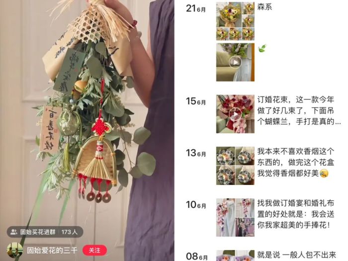 三千的审美积累是在小红书上完成的。她喜欢看欧美花束设计的条记,尤其是小众审美的花束包装,逐渐形成了自己的风格取向。为了发视频条记和花束作品,三千学着拍视频、剪视频。她效仿头部乐成达人的方式,在家里手举自己设计的花束拍照,进行解读和分享。“我包花是森系和复古风格的,所以在复古风格的家居配景下拍出来很好看。我还喜欢种花,粉丝觉得我对花材比力专业,对生活品质有追求,所以各人认可我的设计,就成为我的粉丝了。”