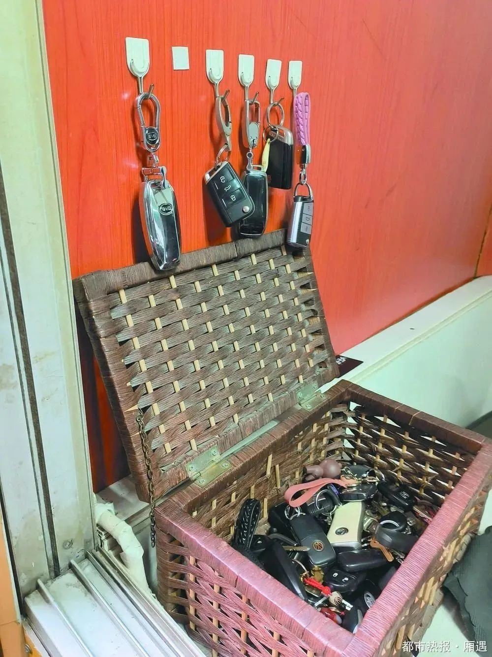 ▲筐内、墙上,都是业主们的车钥匙。小区名为时代天骄,位于渝中区新华路,修建于1999年。